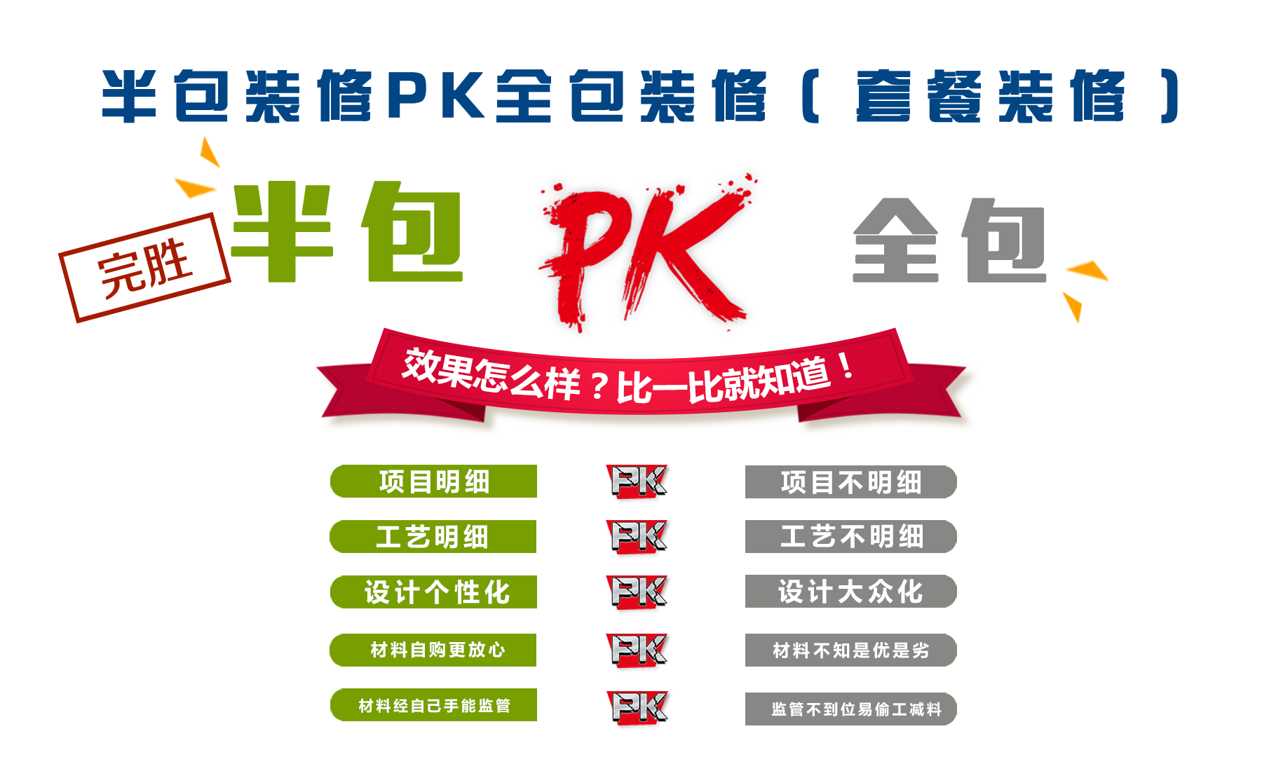 半包的客户其主要原因还是不太信任装饰公司提供的材料,害怕后期偷工减料,出现施工质量问题,当然这部分客户属于比较理智的,宁愿自己麻烦一点,累一点,但毕竟一辈子装不了几套房子,自己全心全意付出的结果,后期也很有成就感,但弊端就是操碎了心,休息时间就必须去材料市场跑材料,最后跑出来的结果在同品牌同型号的基础上还不一定能比装饰公司给的价格如意,不过自己亲自确认亲自买的要放心很多。后期的工地上的监理就是你自己,必须一有时间就去盯着,以免工地上面出任何差池,不然还存在返工这块,后期费用也只能自己默默扛着,特别隐蔽工程如果不过关就贴砖的话想改就是个大工程。